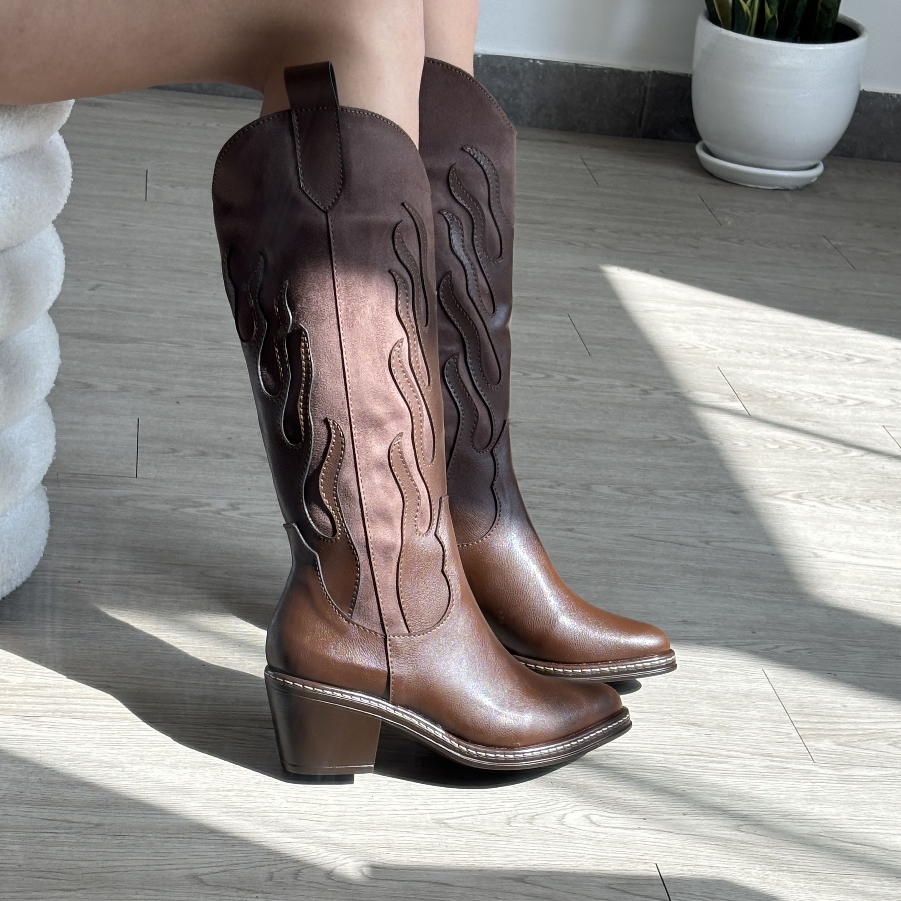 Bota estilo texana, elaborada en biocuero y sueder. Tiene un taco de 5 cm con un cerco en la punta. Planta en material PU liviano. Forro interno textil suave. Guía de tallas abajo.